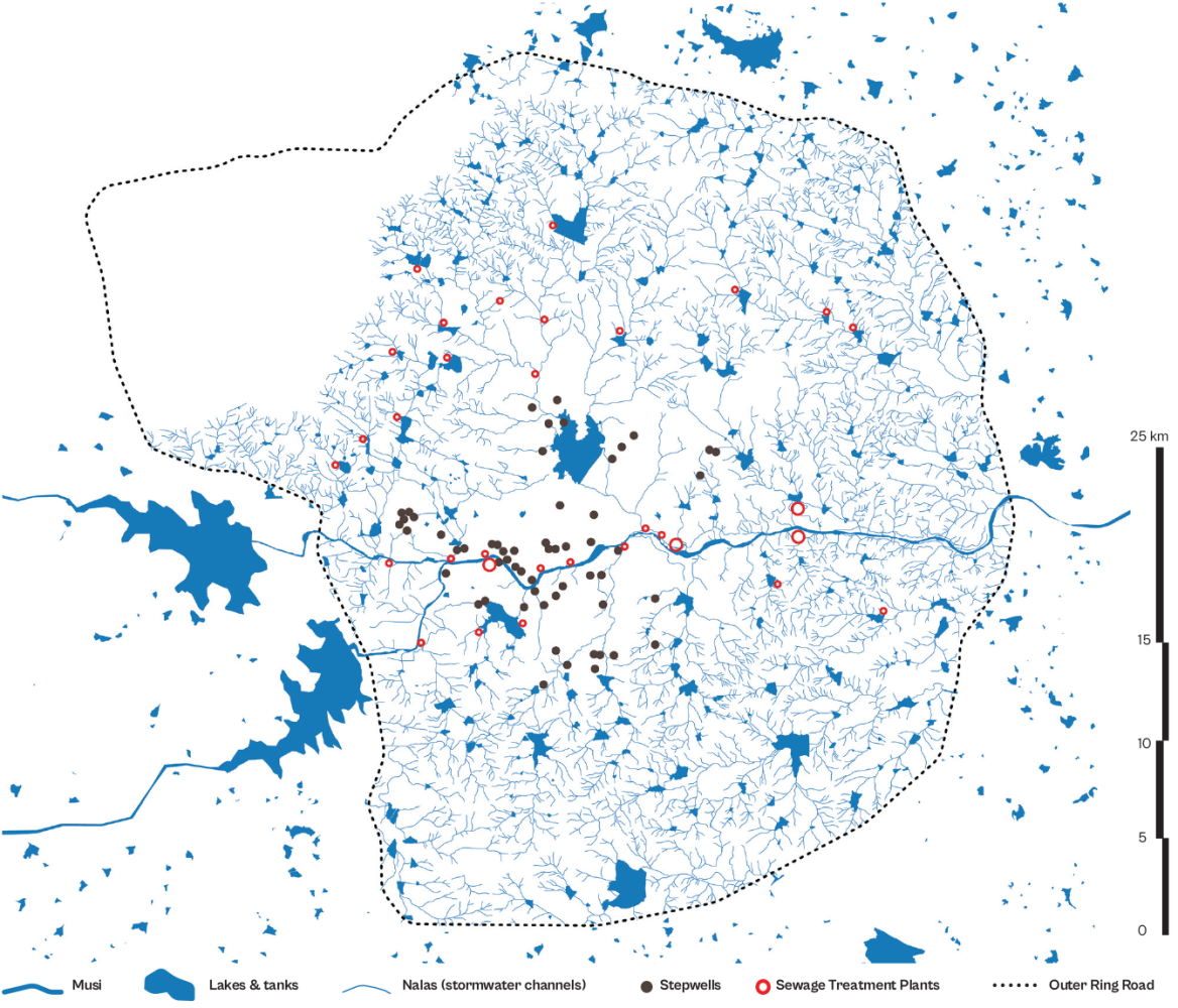 Hyderabad shows what this looked like before that logic took hold. The city once depended on a connected system of lakes, tanks, stepwells, and channels. Rainwater moved gradually across that network, storing water, recharging groundwater, supporting vegetation, and maintaining a more stable local climate. Since the real estate boom of the 1990s and the IT expansion that followed, that system has been dismantled. Hundreds of lakes have been built over or drained, their beds converted into roads and buildings. Those that remain are largely cut off from each other, choked with sewage and pollutants, their edges hardened and their catchments built over.